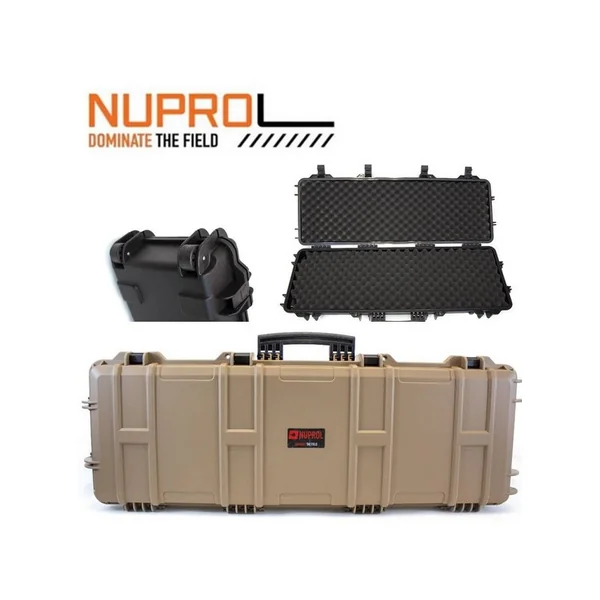 MALLETTE NUPROL WATERPROOF TAN :Caractéristiques :-Mallette de protection anti choc et waterproof.-Mallette Waterproof certifié IP67.-4 fermetures solides.-Poignée de transport sur le dessus.-Poignée latérale pour tirer aisément la mallette.-2 emplacements pour cadenas.*Dimensions intérieures : 98 x 29 x 12,5cm.*Dimensions extérieures : 105 x 33 x 15cm.-Roulettes incluses pour plus de mobilité et moins d’effort !