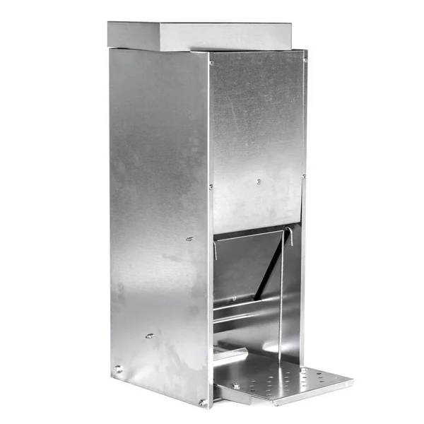 Cette mangeoire anti-gaspillage est conçue pour les volailles. La mangeoire possède un système d’ouverture avec un couvercle amovible ce qui permet de protéger les aliments. La mangeoire est équipée d’une pédale d’ouverture : lorsque l’animal marche sur celle-ci, un rabat de protection s’ouvre et se fixe au dessus de l’auge puis lorsque l’animal retire sa patte, la mangeoire se referme. Les souris, les rats et autres nuisibles ne peuvent donc pas activer le mécanisme en raison de leur poids, ce qui protège complétement la nourriture. Le mécanisme s’active à partir d’un poids d’environ 1kg. Le système d’ouverture est silencieux afin de ne pas effrayer les volailles.