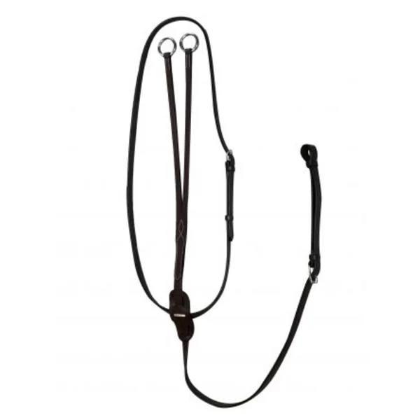 Martingale à anneaux à fixer sur les rênes et la sangle. Permet de limiter le basculement de la tête du cheval vers le haut ainsi que de le canaliser.