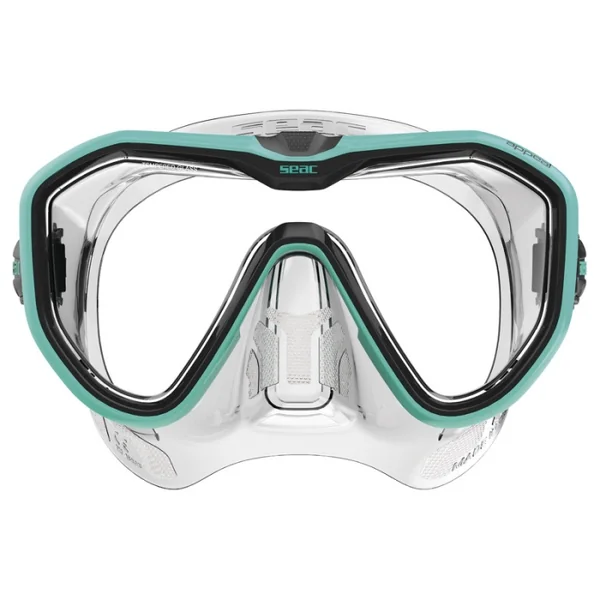 Masque Seac Sub Appeal Transparent/Aqua Le SEAC APPEAL est un masque mono-verre fabriqué en Italie, avec des boucles technologie 3D directement rattachées à la jupe. La bordure de la jupe est légèrement incurvée pour augmenter la surface d’adhérence au visage et augmenter ainsi le confort, l’étanchéité et réduire les marques même en cas d’immersion prolongée.