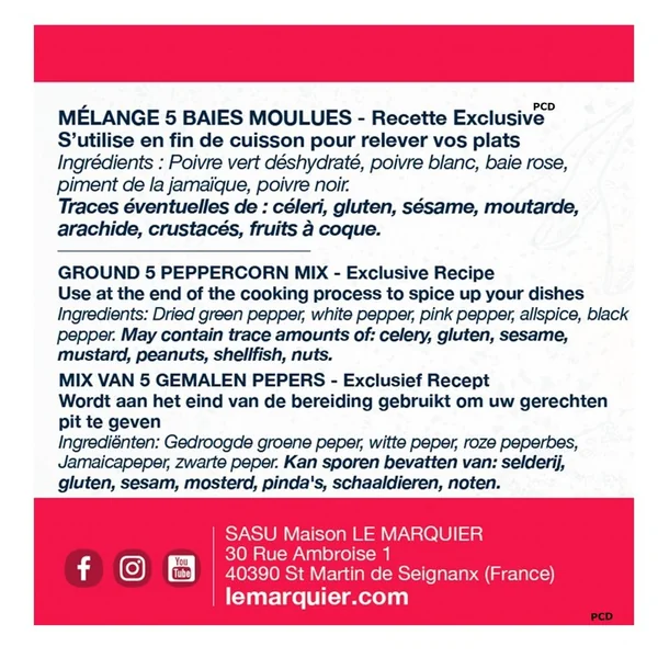 Le mélange 5 baies moulu Le Marquier est idéal pour le poisson blanc, la volaille et les légumes.