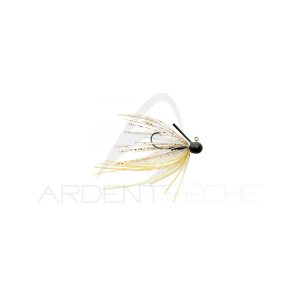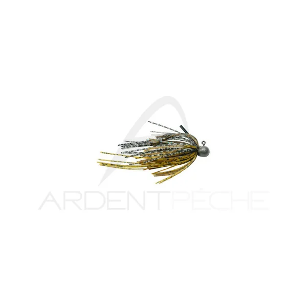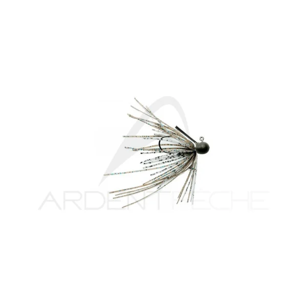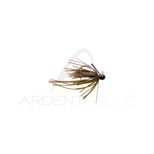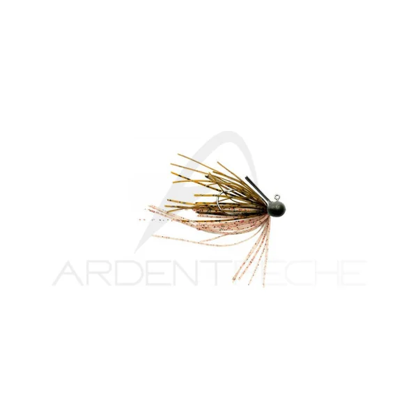Micro rubber jig tungsten avec jupe ligaturée à la main et brosse anti herbe suffisamment souple pour bien se dégager même sur les petits poissons.
