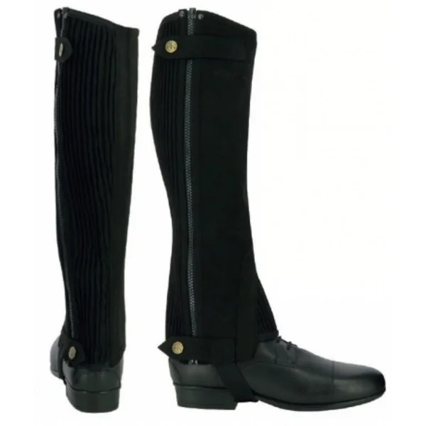 Mini-chaps d’équitation confortable, qui s’adaptent à toutes les moprhologies grâce à sa matière souple. Galbe la cheville, cou-de-pied et arrière du mollet élastiqués en accordéon et recouvert d’amara.
