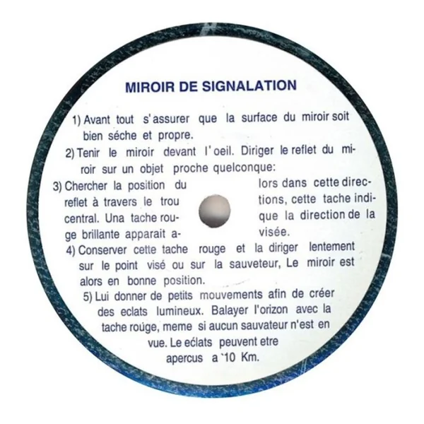 Ce miroir de signalisation est règlementaire et est fortement recommandé pour la survie en mer. Comme il fonctionne avec le soleil, il ne nécessite ni énergie, ni piles et reste utilisable tant qu’il y a de la lumlère solaire. Il est léger, résiste à la casse. Autre avantage, le miroir de signalisation bateau s’utilise avec une seule main, ce qui s’avère pratique lorsque l‘on est en situation critique, agrippé à une bouée de sauvetage par exemple. Il peut s’attacher à l’aide de sa languette permettant le passage d’un cordon, à un gilet de sauvetage ou une ceinture, pour éviter de le perdre.