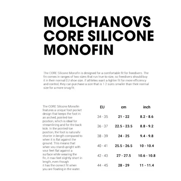 Apportez de la légèreté et de la puissance à vos entraînements et plongées loisir avec la CORE Silicone Monofin. Son design élégant et minimaliste signé Molchanovs, allié à des performances équilibrées, en fait le choix idéal pour tous les niveaux d’apnéistes, mais aussi pour les sirènes recherchant performance et confort.