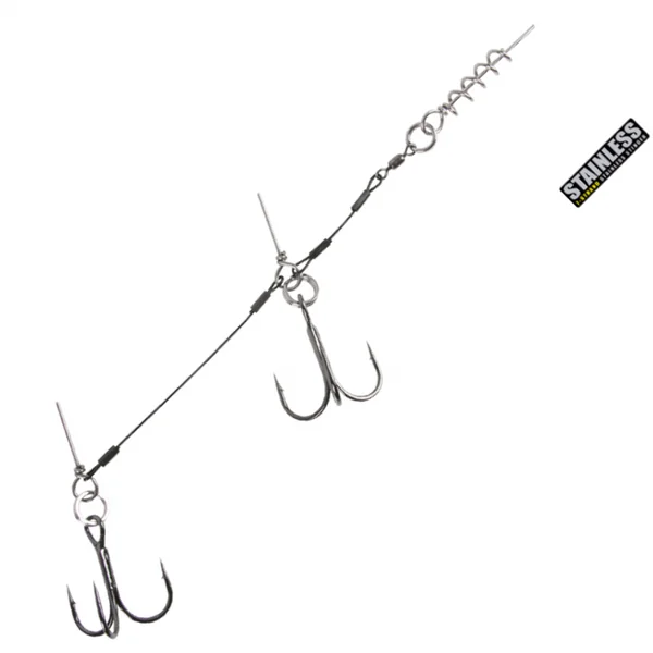 Cette monture est constitué d’un fil inoxydable à 7 brins recouvert de nylon, d’un émerillon BFT Crank en acier inoxydable et de sleeve recouvertes de plastique. Les stingers de chez CWC sont équipés d’un anneau brisé aplati 2X-Strong résistants.