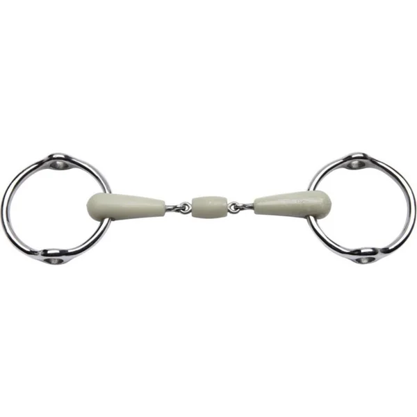 Composition: inox et résine flexi parfum pomme. Canons pleins: 18mm. Anneaux: 65mm. Taille 115 mm Poney C/D, petit cheval (style pur-sang arabo) Les mors en caoutchouc, cuivre, résine, flexi ou recouverts de cuir peuvent s’abîmer très vite suivant la dentition de votre cheval. Il est conseillé de ne pas utiliser un mors trop abîmé au risque de blesser le cheval et il est primordial de vérifier l’état des barres de votre monture, de sa dentition, ainsi que de son palais. Conseils d'entretien: Laver à l'eau après chaque utilisation.