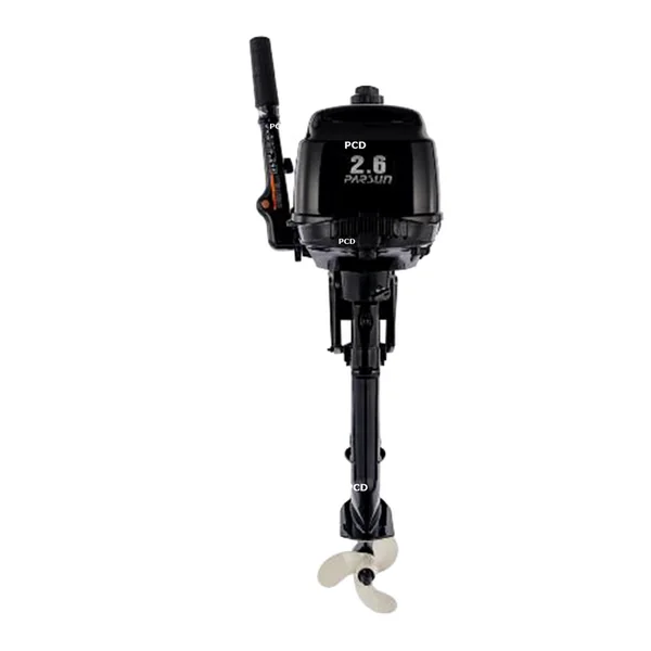 Moteur thermique, de marque Parsun, d’une puissance de 2,6 CV, avec arbre court et barre franche.