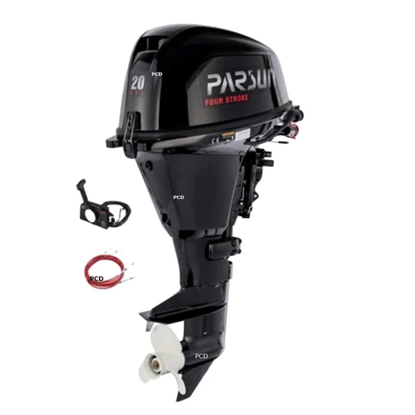 Moteur thermique, de marque Parsun, d’une puissance de 20 CV, avec arbre long, démarrage électrique et commande à distance.