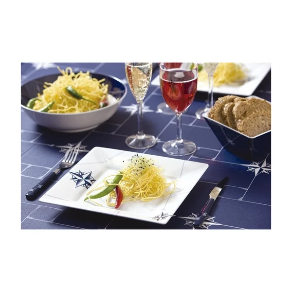 Grâce à son innovante finition en résine, cette nappe est imperméable, mais douce au toucher, et elle empêche que les taches ne s’incrustent dans le tissu. Au design nautique classique, assorti au set de vaisselle en mélamine et à sa verrerie incassable. Disponible en deux tailles, ainsi qu’en blanc avec traitement anti-taches.