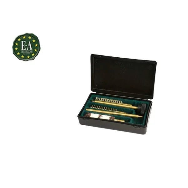 NECESSAIRE DE NETTOYAGE PISTOLET : Caractéristiques : -Boite en plastique moulé. -Intérieur feutrine compartimenté. *Ce kit comprend : -1 baguette 2 pièces en laiton, -3 écouvillons, (crin, laine, laiton) -1 huilier. *Disponible en 3 calibres.