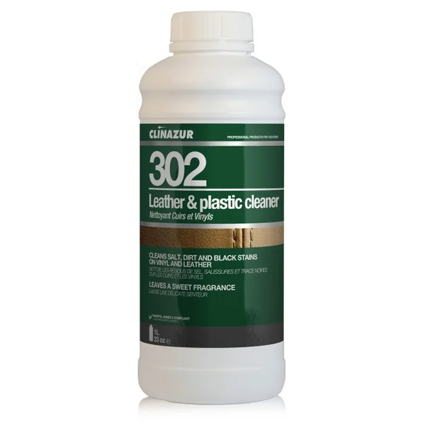 Nettoyant cuir & vinyl Clin’Azur 302 1L Détergent spécialement formulé pour le nettoyage des cuirs, vinyles, skaï et plus généralement des surfaces plastifiées. Produit neutre, non-agressif, qui n’altère pas les couleurs, mousse très peu et laisse les surfaces propres et brillantes. Ne nécessite pas d’action mécanique.