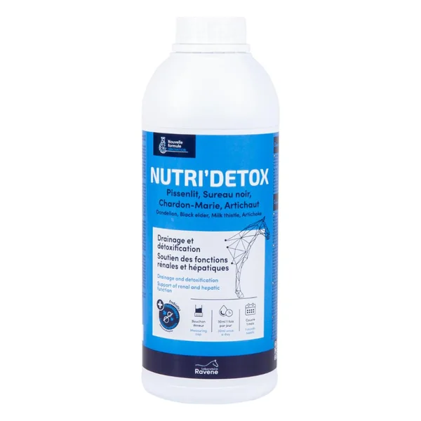 Nutri’Detox est un complément alimentaire liquide de Ravene, conçu pour les chevaux, visant à soutenir les fonctions hépatiques (foie) et rénales (reins) et à favoriser une bonne élimination des déchets métaboliques. Soutien hépatique & rénal : en périodes de stimulation ou de surcharge de l’organisme (alimentation riche, traitement, effort). Équilibre digestif : grâce aux prébiotiques qui favorisent une flore intestinale saine, ce qui peut améliorer l’assimilation des nutriments et l’efficacité du drainage. Préparation & récupération : utile avant ou après un effort ou un événement pour aider à éliminer les déchets métaboliques. Adapté pour les chevaux de sport, de loisir ou même ceux en transition de saison ou après une période de convalescence. Conditions d’utilisation : Bien agiter avant emploi. Pour un drainage / détoxification : donner 30ml par jour pendant 10 à 20 jours.Pour une récupération : donner 30ml par jour 3 jours avant l’échéance puis pendant 7 jours après celle-ci.Pour un poney : diminuer la dose par deux.