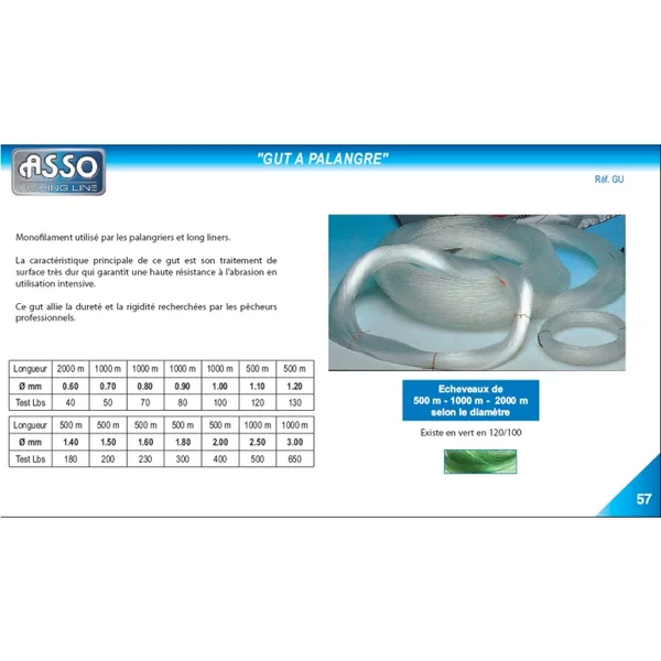 110 à 250/100 vendus par un écheveau de 500 m Caractéristiques Nylon Asso Echeveau Gut à Palangre
