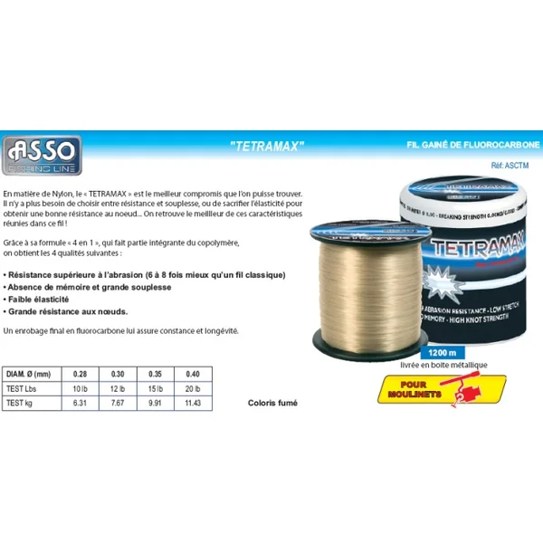 Nylon Asso Tetramax 1200 m En matière de Nylon, le « TETRAMAX » est le meilleur compromis que l’on puisse trouver. Il n’y a plus besoin de choisir entre résistance et souplesse, ou de sacrifier l’élasticité pour obtenir une bonne résistance au nœud… On retrouve le meilleur de ces caractéristiques réunies dans ce fil !