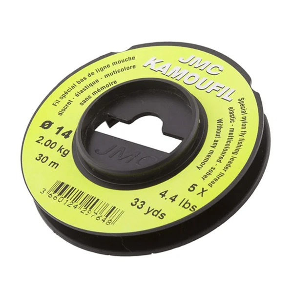 Nylon mouche JMC Kamoufil 100m Il s’utilise pour les corps et pointes de bas de ligne. Les changements de couleurs rendent ce fil invisible car il ne conduit pas la lumière. Fil d’une élasticité sans égal et très résistant aux nœuds, il est dépourvu de mémoire pour permettre au bas de ligne de bien se déployer. Il peut s’utiliser pour tous les types de pêches : sèche, émergente, noyée, nymphe, chironome et streamer. Caractéristiques Nylon mouche JMC Kamoufil 100m