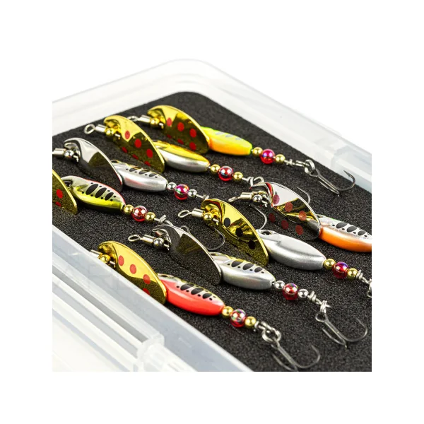 Pack de cuillers tournantes Duo Ryuki spinner pour la pêche de la truite. Vous retrouverez 4 cuillers en 3.5g et 4 en 5g de coloris différents pour couvrir une multitude de situations, eaux teintées, eaux claires, soleil, temps couvert, petites rivières, moyennes rivières…Le tout est livré dans une boite Meiho CS F9 que vous n’avez qu’à glisser dans votre poche ou votre sac pour partir à la pêche.