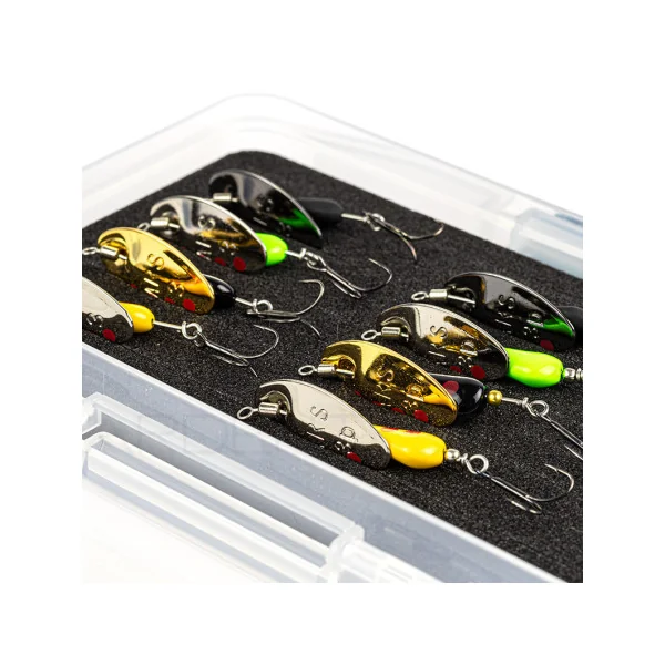 Pack de cuillers tournantes Smith AR S pour la pêche de la truite. Vous retrouverez 4 cuillers en 3.5g et 4 en 4.5g de coloris différents pour couvrir une multitude de situations, eaux teintées, eaux claires, soleil, temps couvert, petites rivières, moyennes rivières…Le tout est livré dans une boite Meiho CS F9 que vous n’avez qu’à glisser dans votre poche ou votre sac pour partir à la pêche.