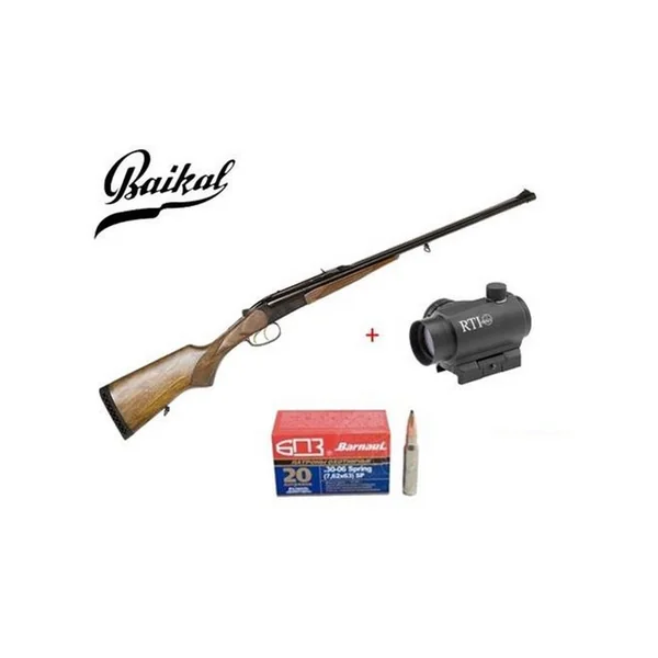 PACK EXPRESS MP221 ARTEMIDA EXTRACTEUR BAIKAL 30-06 SPRG : *Pack comprenant 1 express Artémida Baikal calibre 30-06 Sprg + 1 micro point RTI (voir visuel additionnel) + un rail adapté pour le montage (11/21) + une boîte de balles BARNAUL.*Express Artémidia Baïkal 30-06 Sprg :*Garantie 2 ans.-Carabine double express au rapport qualité-prix imbattable !-Très facile d’utilisation et très sécurisante grâce à son canon basculant.-Idéal pour les battues au Grand gibier.-Possibilité de monter une lunette ou un point rouge grâce à son rail de fixation.*Caractéristiques Techniques :-Longueur du canon : 60cm.-Calibre : 30-06 Sprg.-Double détente.-Extracteurs.-Couleur de la bascule : Noire.-Crosse : Bois de qualité vernis.-Poids : 3kg100 environ.*Prix de vente conseillé de l’express seul 2016 : 899€. *VISEUR MICRO POINT RTI :-Point rouge compact, léger et performant.-11 niveaux d’intensité lumineuse.-Poids : 105g.-Absence de parallaxe.-Résiste à leau.-Rail Weaver intégré, 21 mm.-Livré avec une pile CR2032 et bonnette de protection.*Dimensions :-Longueur : 62mm,-Hauteur : 46mm.*Prix de vente conseillé du point rouge seul 2016 : 129€.*ARME SOUMISE A LA LEGISLATION : Carte d’identité + Permis de chasse OU Licence de tir VALIDES OBLIGATOIRES.*AUCUNE LIVRAISON NE POURRA INTERVENIR SANS PIECES JUSTIFICATIVES.