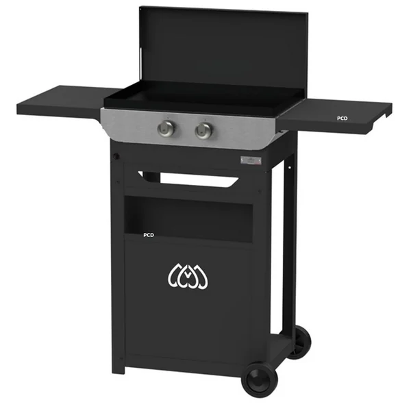 Découvrez cette plancha gaz Le Marquier avec son chariot et son couvercle.