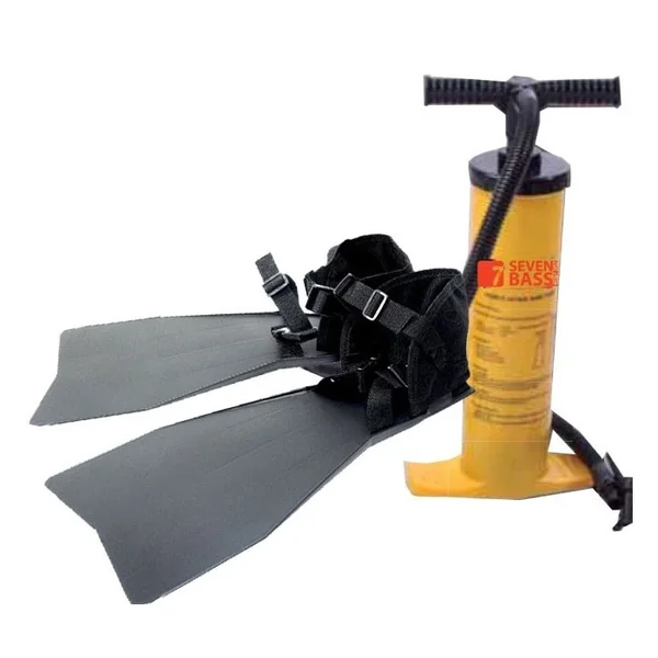 Pack comprenant une pompe à mains double action (gonflage plus rapide) fournie avec plusieurs embouts, et une paire de palmes spéciales float tube.