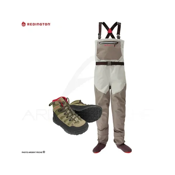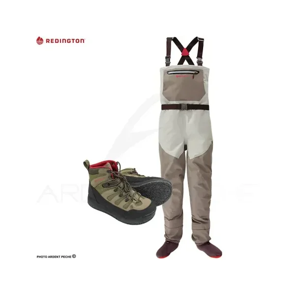 Pack waders respirants Redington Sonic Pro Grey et chaussures de wading Forge avec semelle en caoutchouc offrent légèreté, robustesse et séchage rapide, idéales pour la pêche aux leurres, à la mouche, au toc, etc.
