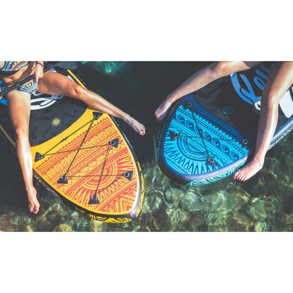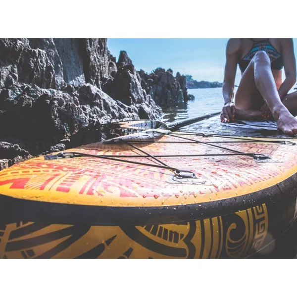 Le SUP est accompagné d’un aileron central démontable, d’un élastique de pont (déjà monté) ainsi qu’un kit de réparation. D’autres accessoires peuvent être inclus comme une pagaie et un leash, et nous vous invitons à consulter la configuration des produits du pack pour en prendre connaissance.