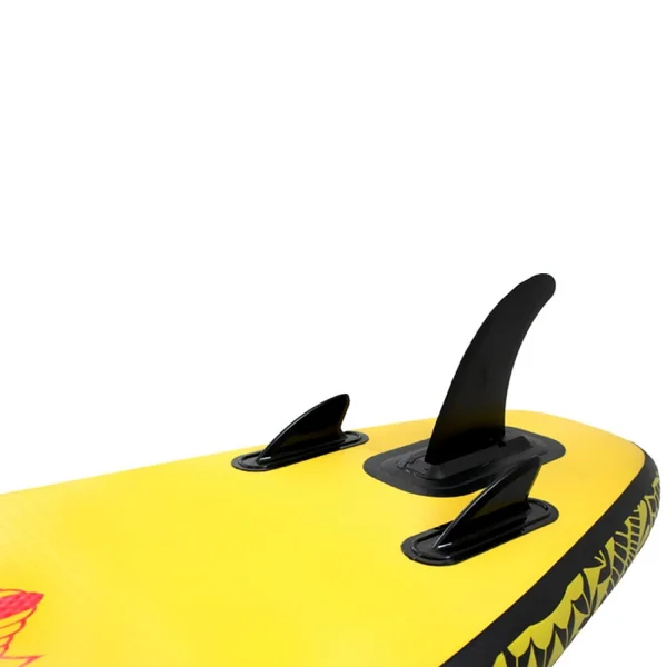 Le SUP gonflable Pride est équipé de 3 ailerons : 2 fixes et un aileron central amovible. Les ailerons latéraux sont moulés pour être très solides. Si vous les tordez, vous pouvez les redresser avec de l’eau chaude ou un sèche-cheveux grâce à leur mémoire thermique. La dérive centrale mesure 10″ et se fixe dans un boitier à glissière. Il est sécurisé par une clavette.