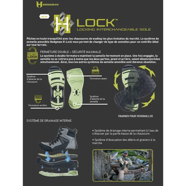 Pêchez en toute confiance avec le système de semelle interchangeable Hodgman™ H-Lock™ conçu pour permettre aux pêcheurs de s’adapter à toutes les situations.