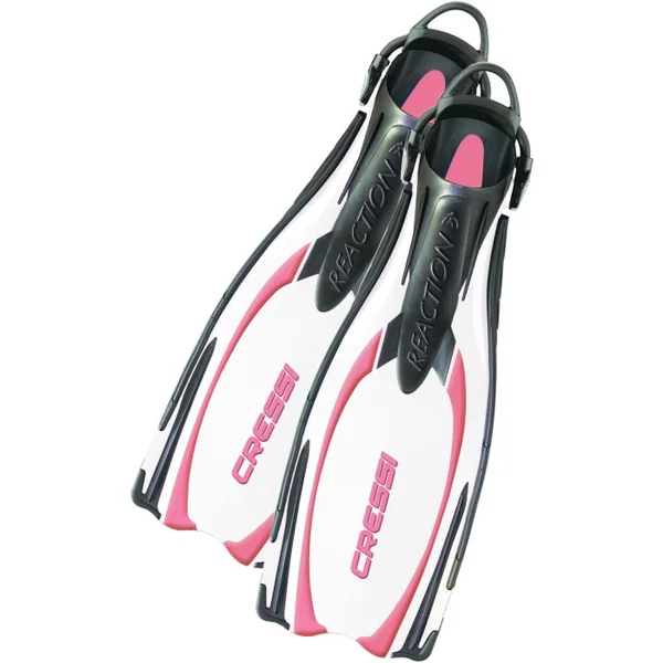 Palmes Cressi Reaction EBS Blanc/rose Reaction est la dernière née des palmes Cressi pour la plongée bouteille. Elle exploite la technologie Cressi, exclusive et brevetée, du moulage en trois matériaux qui garantit des prestations inégalables. Reaction reprend plusieurs des caractéristiques innovantes introduites par la Rondine A. Par exemple la voilure qui débute directement sur le dessus du chausson, son épaisseur différenciée, les longerons réalisés en 2 matières différentes, la semelle entièrement moulée avec un matériau antidérapant, le très commode logement du pied étudié sur ordinateur et les nouvelles boucles imperdables. A ces excellentes caractéristiques, Reaction ajoute une nouvelle voilure plus longue, flexible et légère, capable de produire une excellente propulsion avec le minimum de fatigue musculaire et de dépense d’énergie. Le résultat est une palme parfaite pour le plongeur moderne, du débutant au professionnel, légère, facile à utiliser et peu fatigante. Elle est cependant capable de fournir une remarquable poussée propulsive qui permet d’affronter en toute sécurité les situations les plus critiques en plongée.
