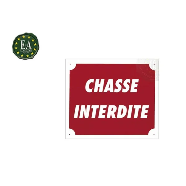 PANCARTE CHASSE INTERDITE : Caractéristiques : -Pancarte « Chasse interdite ». -Taille : 30 x 25cm. *Disponible en Akylux ou en Aluminium.