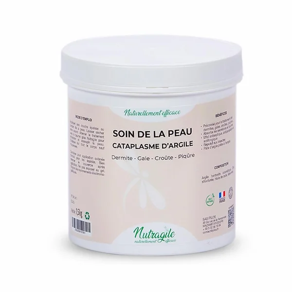 La Pâte d’Argile Soins de la Peau Nutragile est un soin topique 100 % naturel, spécialement formulé pour traiter diverses affections cutanées chez le cheval, telles que les dermites, les gales, les croûtes et les piqûres d’insectes. Ce cataplasme d’argile associe les propriétés de l’argile bentonite, de l’eau structurée, de l’huile de cade pure et du jus d’aloe vera pour offrir une solution efficace et respectueuse de la peau de l’animal. Traitement des affections cutanées : Efficace contre les dermites, gales, croûtes et piqûres d’insectes. Propriétés antiseptiques et antiparasitaires : Aide à purifier la peau et à éloigner les agents pathogènes. Réduction des démangeaisons et inflammations : Apaise les zones irritées et sensibles. Favorise la cicatrisation : Accélère la régénération des tissus cutanés. Prête à l’emploi : Facile à appliquer et à retirer, sans besoin de couverture supplémentaire. Conditions d’utilisation : Appliquer une couche épaisse de pâte d’argile sur la zone affectée. Laisser sécher sans couvrir, permettant ainsi au cataplasme d’agir efficacement. Retirer le cataplasme à l’aide d’une brosse douce ou d’une éponge humide. Alterner l’application avec le Baume Gras Réparateur Nutragile pour réhydrater et assouplir la peau.