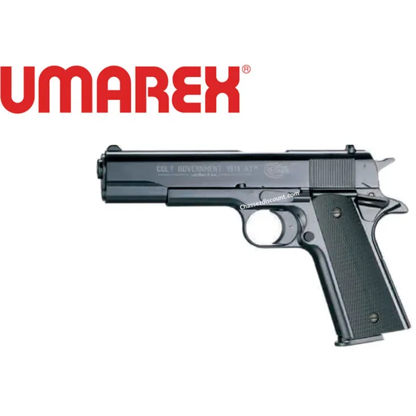 PISTOLET COLT GOVERNEMENT 1911 NOIR UMAREX : Caractéristiques : -Pistolet de tir à blanc 9mm, -Longueur : 22 cm, -Poids : 1000g environ, -Capacité : 8 coups. -Monolanceur de fusée 15mm inclu. *Prix de vente conseillé en 2015 : 199 euros. PISTOLET SOUMISE A LA LEGISLATION : CARTE D’IDENTITE OBLIGATOIRE.