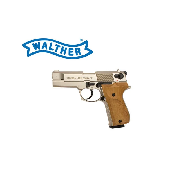 PISTOLET PP88 NICKELE PLAQUETTES BOIS WALTHER : Caractéristiques : -Pistolet de tir à blanc 9mm, -Longueur : 18.2 cm, -Poids : 940g environ, -Capacité : 10 coups. -Monolanceur de fusée 15mm inclu. *Prix de vente conseillé en 2015 : 309 euros. PISTOLET SOUMISE A LA LEGISLATION : CARTE D’IDENTITE OBLIGATOIRE.