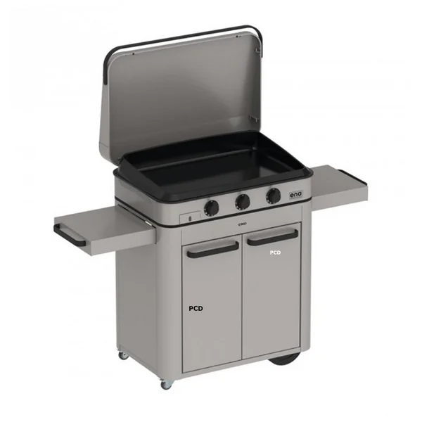Découvrez cette plancha gaz sur chariot en inox de la marque française Eno, équipée d’une plaque en fonte émaillée avec le trou de récupérateur de graisse qui vous permettra des cuissons de vos mets préférés à la perfection.