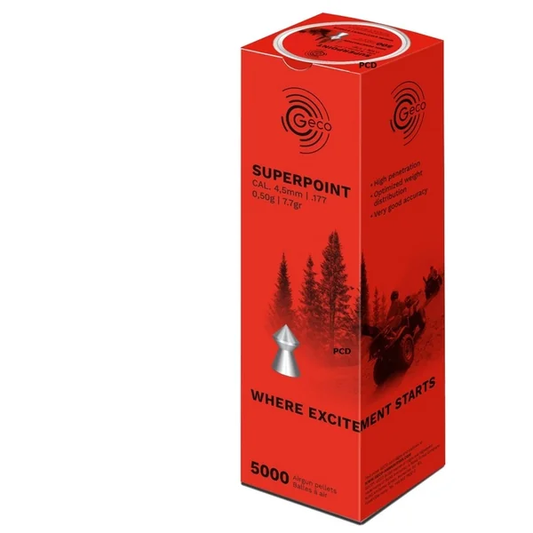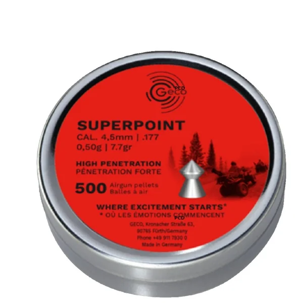 La munition pour armes à air comprimé Geco Superpoint dispose d’une tête conique, une caractéristique qui lui confère une forte puissance de perforation et de pénétration.
