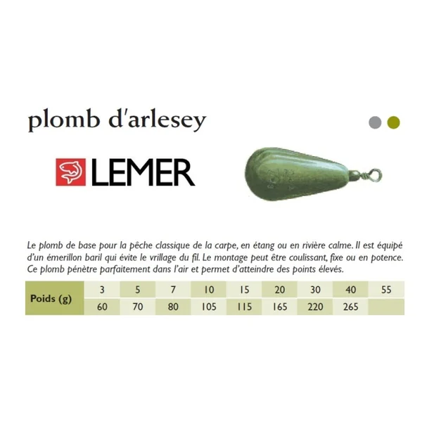 Le plomb de base pour la pêche classique de la carpe, en étang ou en rivière calme. Il est équipé d’un émerillon baril qui évite le vrillage du fil. Le montage peut être coulissant, fixe ou en potence.