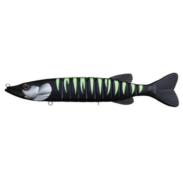 Ce swimbait articulé, composé de 11 segments, offre une nage incroyablement fluide et naturelle, imitant à la perfection un véritable brochet évoluant dans son environnement. Avec ses 35 cm de longueur et ses 185 g, il appartient à la catégorie des big baits, spécialement pensés pour cibler les carnassiers les plus imposants et sélectifs. Son action de nage en S est facile à mettre en place en linéaire, idéale pour déclencher des attaques violentes de la part des brochets les plus méfiants.