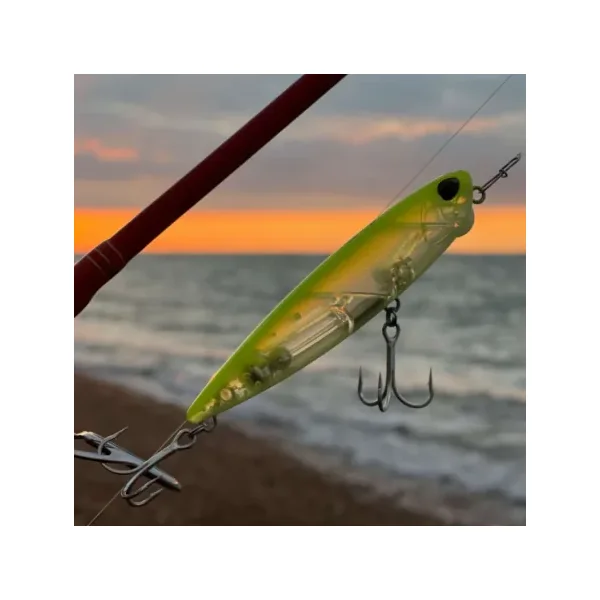 Equipé d’hameçons triples prévus pour un usage en milieu marin, le Realis Pencil 110 SW est un stickbait très bruiteur qui attire les prédateurs de loin. Il est particulièrement facile à manier dans les vagues et les eaux agitées et sa densité lui permet datteindre de grandes distances de lancer. Nous conseillons particulièrement ce leurre pour peigner très rapidement une zone et se faire vite une idée de l’activité des poissons.