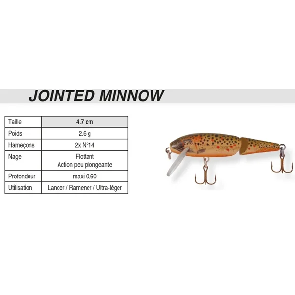 Poisson Nageur Rebel Jointed Minnow 4.7 cm Poissons Nageurs flottants articulés peu plongeants pour pêcher les truites en ruisseaux et petites rivières .