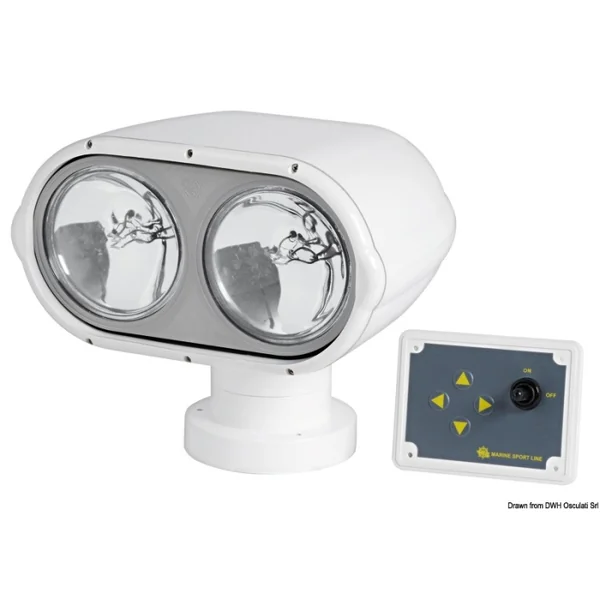 Projecteur Osculati Night Eye avec 2 ampoules étanches 12 V Equipé de 2 ampoules étanches “Sealed Beam” de Ø 127 mm chacune avec ampoules halogènes, puissance 2 x 55 W. Rotation 380°, haut et bas 70°. Boîtier en Luran blanc, résistant aux UV. Livré avec panneau étanche multifonction. Dimensions: hauteur 205 mm, profondeur 220 mm, panneau 270×135 mm, base Ø 120 mm