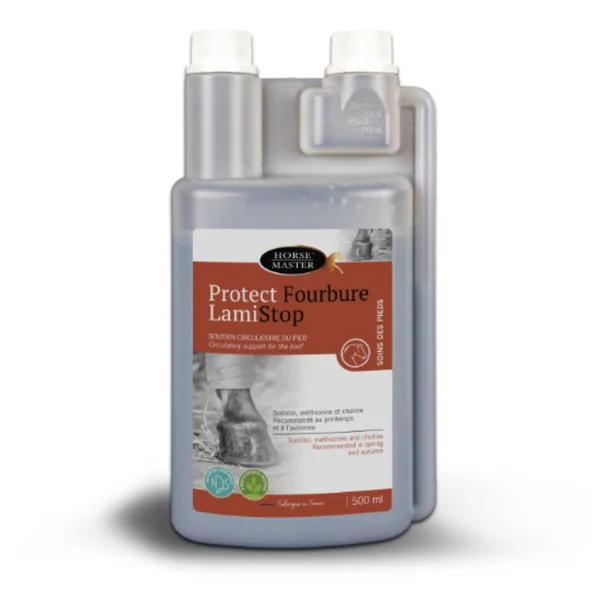 Le Protect Fourbure est un complément oral liquide conçu pour prévenir et soutenir les chevaux sujets à la fourbure ou en risque (chevaux en surpoids, à l’herbe au printemps/automne, atteints de Cushing, ou ayant déjà présenté des crises) Il vise à soutenir la circulation sanguine locale et le drainage hépatique/urinaires pour atténuer les symptômes (pieds chauds, boiterie, raideur) Prévention et soutien en phase aiguë : pour chevaux sensibles, faibles ou en risque accru à certaines saisons Drainage métabolique : aide à éliminer les toxines circulantes en stimulant le foie et les reins Soutien circulatoire local : améliore la perfusion sanguine du pied, limitant l’inflammation associée à la lamellite Effet anti-inflammatoire : l’anis vert et les extraits végétaux réduisent l’inflammation et la douleur Sans substance dopante : autorisé en compétition, compatible FEI/ADMR Usage recommandé en complément de : régime hypocalorique, limitation d’accès à l’herbe, maréchalerie adaptée, contrôle vétérinaire
