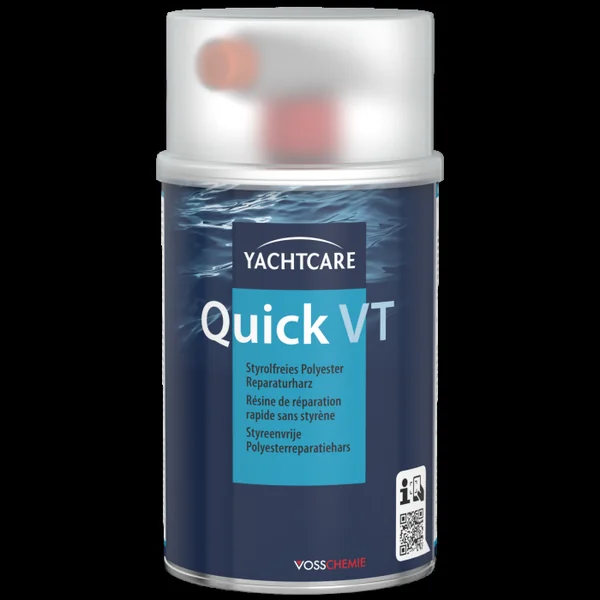 Résine de réparation Yachtcare Quick 1kg Résine à durcissement rapide, accélérée aux amines, mise en oeuvre pour les réparations d’urgence de dégâts sur le métal, le bois ou le stratifié. Pour obtenir une surface non collante, recouvrir YC RESINE DE REPARATION RAPIDE de mastic ou avec YC VERNIS POLYESTER en finition.