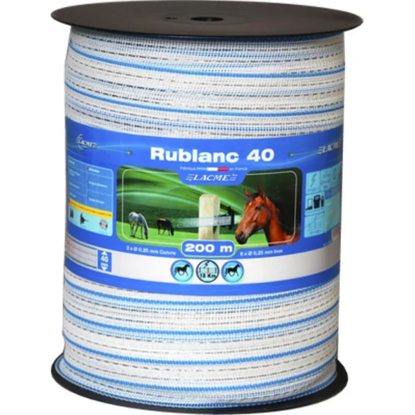 Ce Rublanc 40 est un ruban adapté à l’élevage des chevaux et parfait pour être placé dans des zones abritées des vents dominants. Il possède des conducteurs groupés anti-coupure et mixte cuivre / inox.