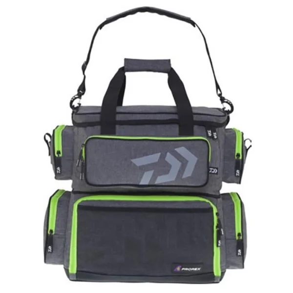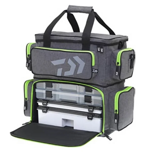 Deux récents bagages renfermant des boîtes à leurres exclusives de la marque Daiwa, adaptées à toutes les techniques de pêche des carnassiers.