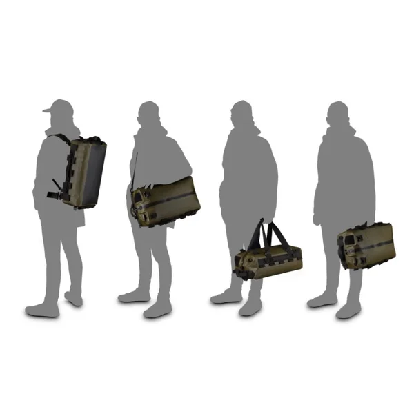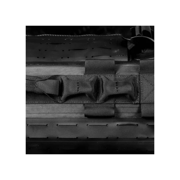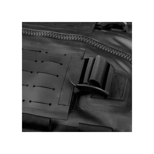 La série HYBRIDUFFLE est dotée d’empiècements de type MOLLE laser cut afin de permettre l’adjonction de poches (en particulier sur le dos du sac) et l’attache de différents objets longs : armes, pieds, photos, cannes à pêche, etc.