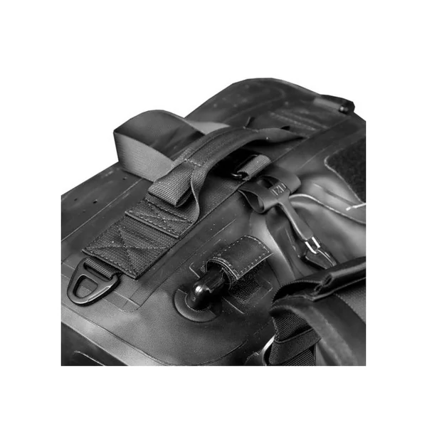 Des passants en sangles tout autour du sac permettent l’accroche rapide de mousquetons et la confection d’un tressage en corde pour sécuriser des objets encombrants.