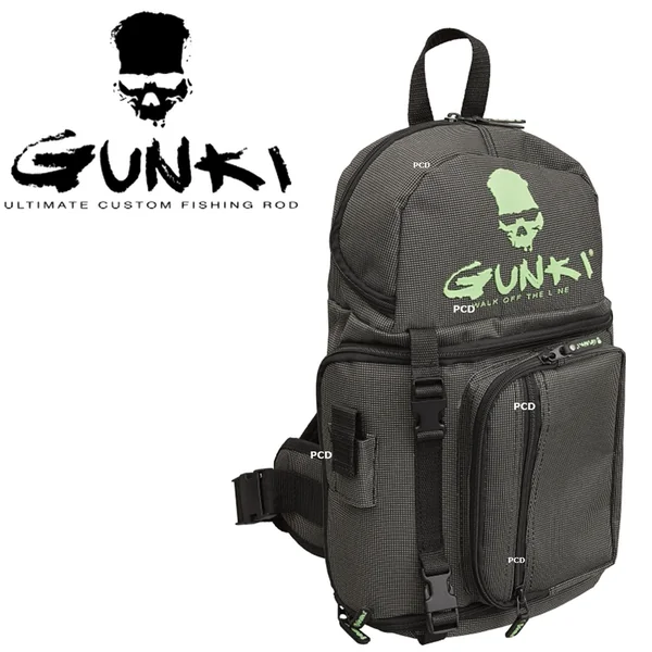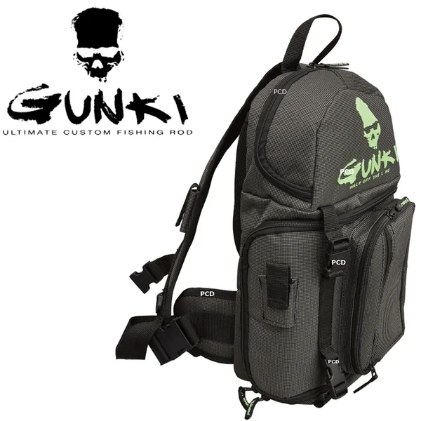 Sac à dos compact, de marque Gunki, qui peut se tourner (sans avoir à l’enlever) pour le passer d’une position dorsale à une position ventrale, offrant un accès rapide au matériel stocké dans les poches.