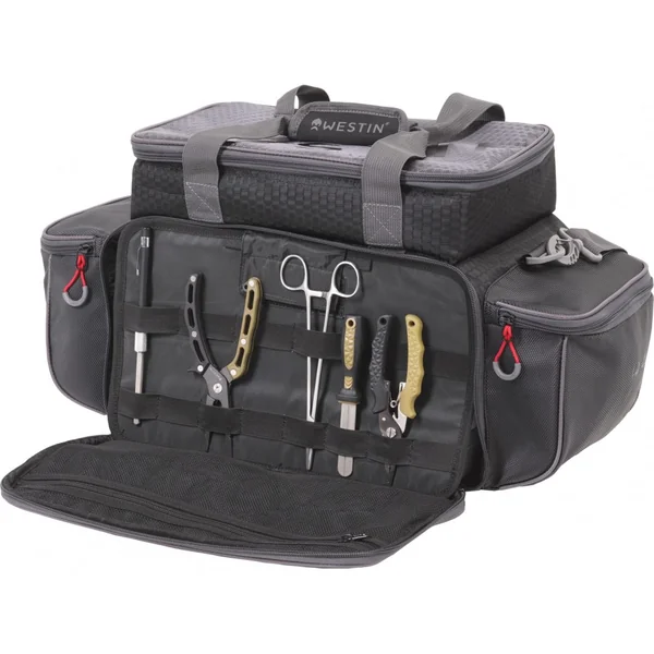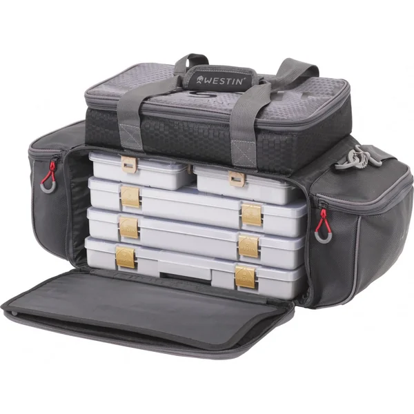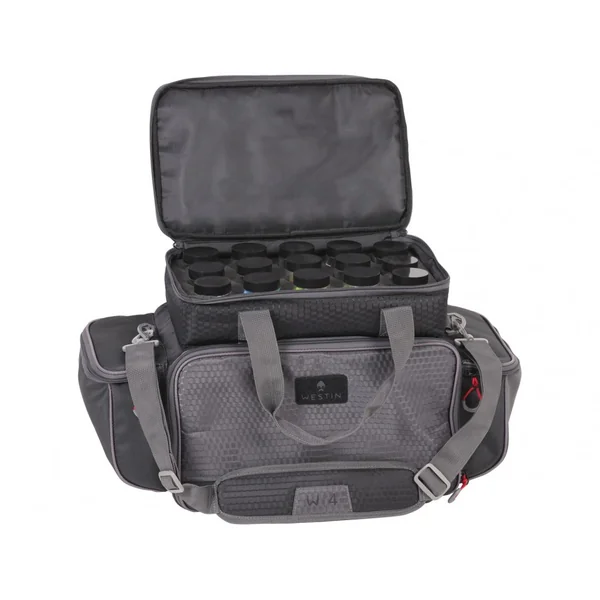 Le compartiment principal du W4 P&T Master Bag est spacieux et comprend cinq boîtes de pêche Westin, fournissant un espace suffisant pour ranger vos leurres, hameçons et autres accessoires essentiels. Ces boîtes sont conçues pour maximiser l’organisation et la protection de votre matériel, vous permettant de trouver rapidement ce dont vous avez besoin.
