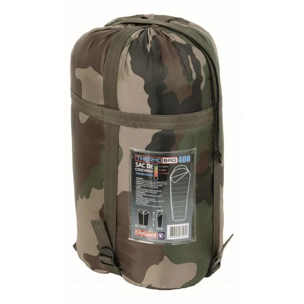 Composition : 100% polyamide 210T ripstop déperlant et anti-tache – ouate fibre creuse 100% polyester, 2 x 200g/m² – doublure microfibre 100% polyester toucher doux. Dimensions : 230x90cm en haut x65cm en bas. Coloris : Camouflage.